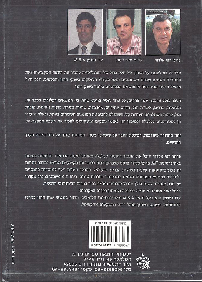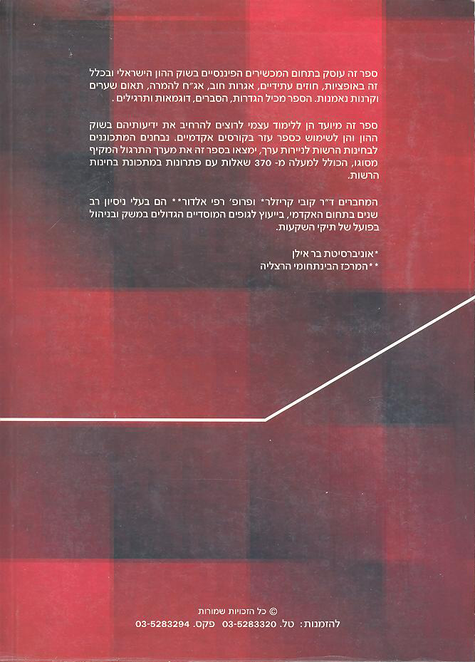 ספר זה עוסק בתחום המכשירים הפיננסיים השוק ההון הישראלי ובכלל זה באופציות, חוזים עתידיים, אגרות חוב, אג"ח להמרה, תאום שערים וקרנות נאמנות.